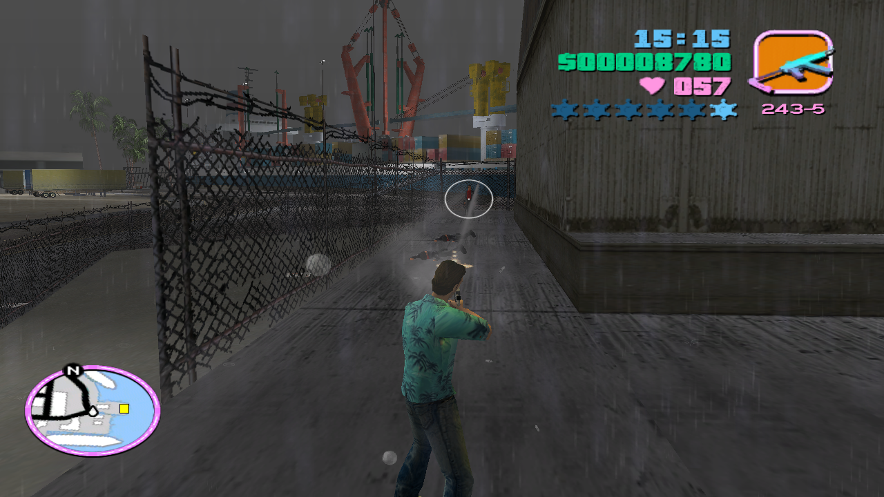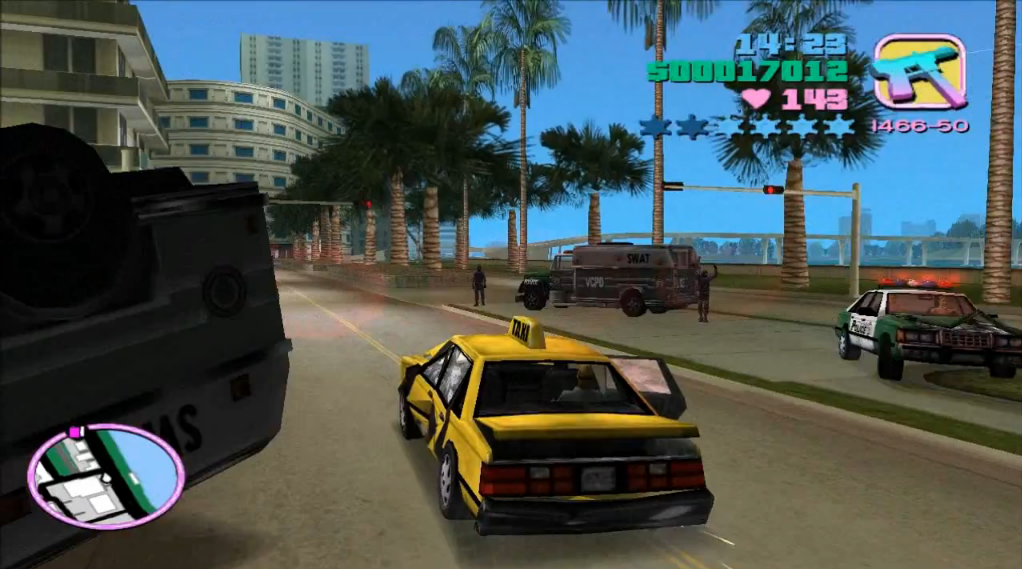 If – and this is a big if – you can clear these barriers to entry, the namesake city is still as engaging as ever – even now, in an age where open-world environments are a dime-a-dozen; and as far as I can see, this is the main reason why you’ll want to return to it with the recent re-release. Whereas Grand Theft Auto III chose Goodfellas as its major design inspiration, Vice City leaned heavily on an amalgamation of Scarface and Miami Vice, and as a result delivered a world evocative of the glitz, glamour and grotesquery most would associate with 80’s-era Miami. Instead of gunning for realism or grit, the game gave us a disjointed playground of images; areas ripped from or inspired by movie scenes and book descriptions, and stitched them together into something coherent, and just a bit magical.