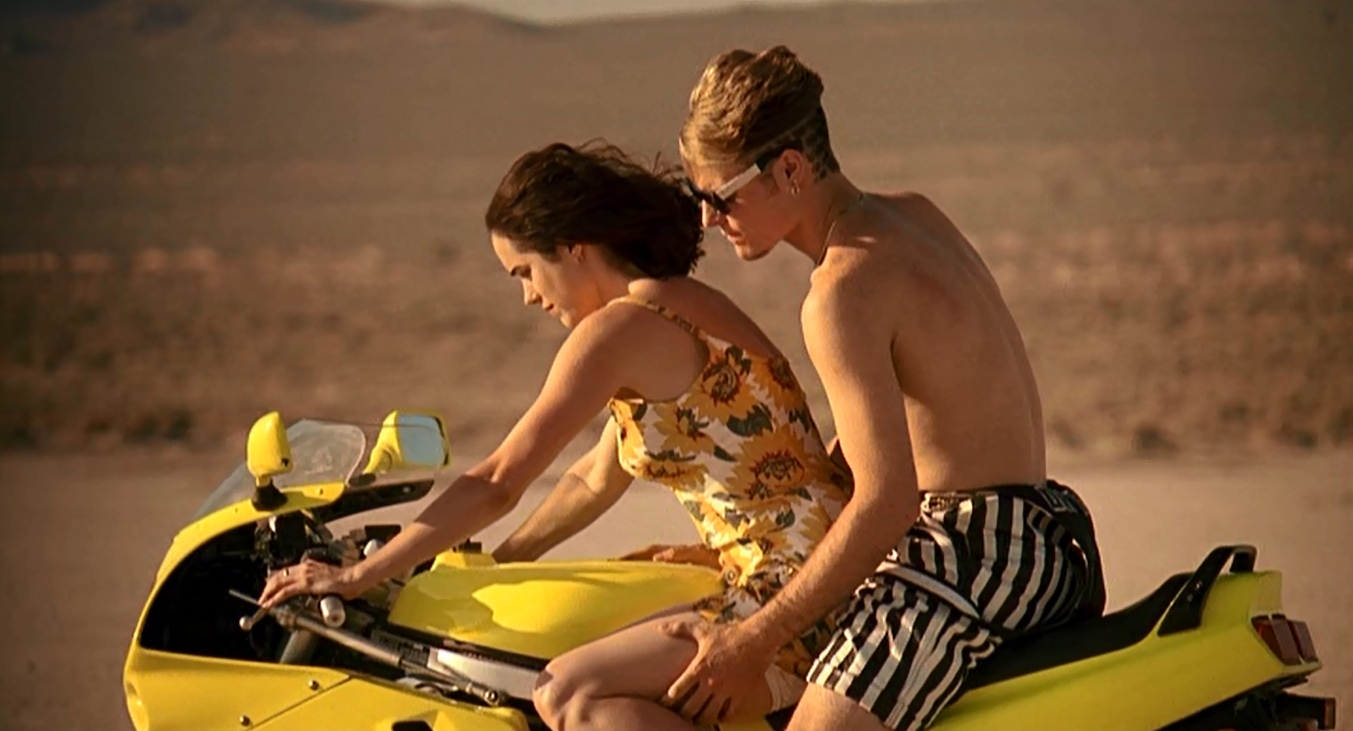 It’s also surprisingly functional as a film. I think it’s worth mentioning that, before shooting Cool as Ice, director David Kellogg had worked regularly for Playboy, helming the annual Playboy Video Playmate Calendar for four years running. Aptly, there is something mildly pornographic about Cool as Ice: it revels in long, lingering close-ups, albeit with a staccato approach to non-action scenes, weaving between MTV style quick-cuts and long, bare-all shots of dance routines and bike rides. Kellogg’s background in softcore calendar shoots leaves the film feeling airy and surreal, as if ready to break into a commercial announcement at any second.